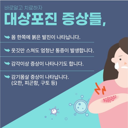 요즘은 대상포진이 면역력이 약한 60세 이상뿐만 아니라, 스트레스에 취약하고 면역력이 떨어진 30-40대에게도 심심치 않게 나타나는 것 같습니다. 대체적으로 계절이 바뀌면서 갑작스러운 일교차로 인해 면역력이 저하되기 쉬운 7~9월 사이에 호발하는 양상을 보입니다. 대상포진은 수두-대상포진 바이러스가 몸속에 잠복상태로 존재하고 있다가 다시 활성화되면서 발생하는 질병입니다. 보통은 수일 사이에 피부에 발진과 물집 형태의 병변이 나타나고 해당 부위에 통증이 동반됩니다. 통증은 개인마다 달라서 견딜 수 없을 만큼 심한 통증을 경험하기도 합니다. 대부분 피부에 국한되어 나타나지만 면역력이 크게 떨어져 있는 환자에서는 전신에 퍼져서 사망에 이를 수도 있습니다.